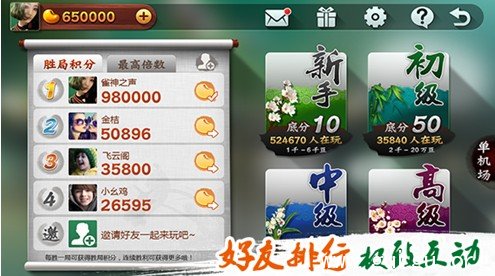《欢乐麻将》支持通过微信和QQ帐号登录游戏,通过胜局排行和财富榜跟微信QQ好友比拼。玩的局数越多积分越高,或者获胜的局数越多也增加积分,从而在“胜局积分”中获得更高排行,是展示自己的牌技与成绩的最直接方式。