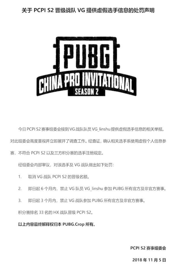 而官方做出的处罚是,取消VG战队的PCPI S2赛事(绝地求生中国职业邀请赛第二赛季)晋级名额,同时对选手linshu禁赛6个月,对VG战队禁赛3个月。