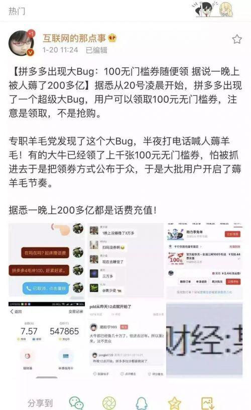 1月20日,微博大V @互联网那些事爆料,拼多多百元通用优惠券的营销推广出现重大漏洞,无论新老用户,都可以领取100元无门槛券,注意是领取,不是抢购。有网友通过接码平台充值了54万的Q币和64万的话费。