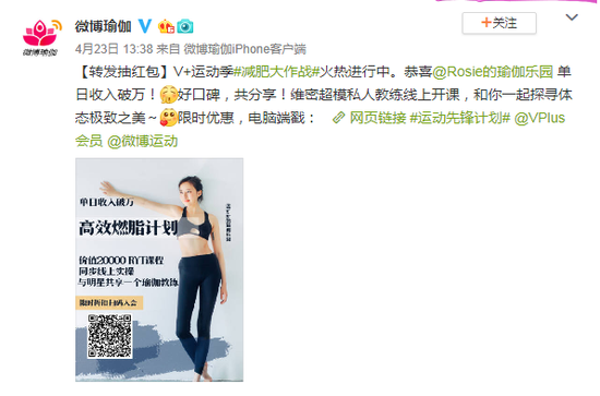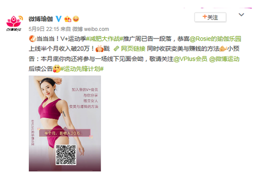 值得一提的是,运动健身博主@Rosie的瑜伽乐园 在活动期间通过V+会员售卖达成单日收入破万、半个月收入破20万的优异成绩,影响力不言而喻。去年V峰会期间,微博宣布将持续加大对各领域内容作者的商业赋能,新增了广告共享、内容导购、V+会员等多元的变现方式。微博希望能够帮助更多的内容创作者找到适合自身的变现工具,也将继续提供更多的高效变现方式。