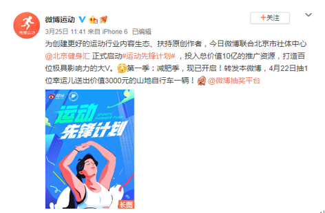 为了创建更好的运动行业内容生态,扶持原创作者,助力内容变现,2019年微博联合北京市社体中心启动“运动先锋计划”,投入总价值10亿的推广资源,打造百位极具影响力的大V。
