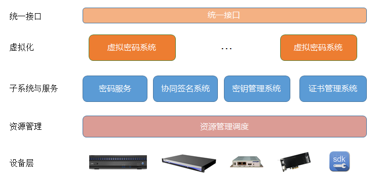 在系统架构上,东进技术超融合高性能的签名验签算力平台分为五层,底层是设备层,包括各类的密码设备,第四层是统一的资源管理调度,第三层是子系统与服务,第二层是提供虚拟的密码系统,最上层提供统一接口。