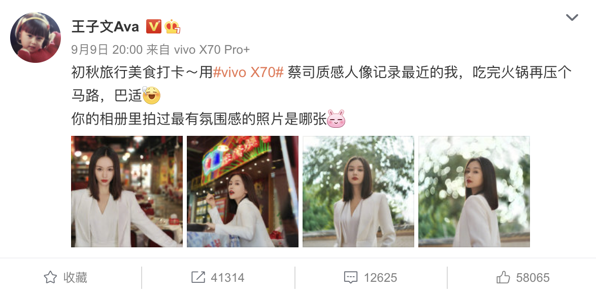 X70系列发布会刚结束,演员王子文就用vivo X70 Pro+记录下了自己的初秋之旅。在蔡司经典人像风格下,王子文状态轻松,吃火锅压马路,假期氛围感一键到位。王子文的晒图正是来自于vivo X70系列复刻蔡司的四个经典镜头,更具真实蔡司光学的味道。