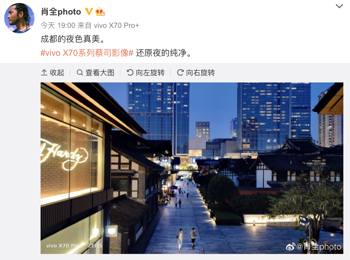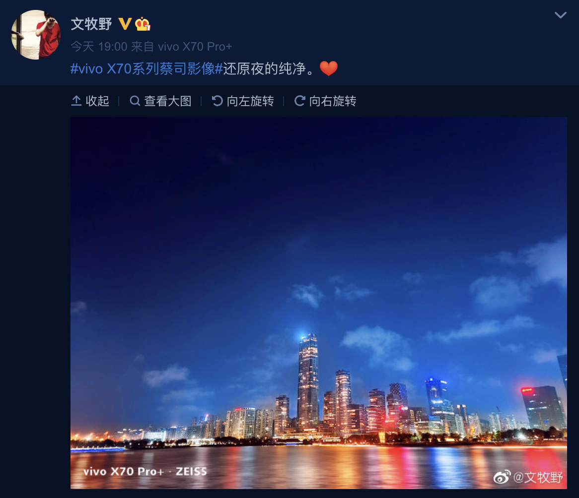 除了人像摄影,在很多人感兴趣的夜景拍摄方面,也是明星十分关注的亮点。最近因综艺节目火出圈的黑豹主唱张淇以及演员张嘉倪,同样也是vivo X70系列的首批用户,对vivo X70 Pro+欣赏有加,在微博分享了夜景照片,也让粉丝感叹:“这么好看的夜景,慕了慕了!”