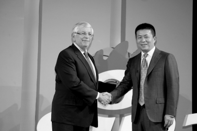 这是新浪第二次和NBA官方签约,第一次是三年前在广州。三年前,新浪也有了微博,风头正盛,曹国伟跟大卫·斯特恩打了一个赌,当时NBA官方微博刚刚在新浪微博起步,大概是有一、两百万粉丝,曹国伟跟大卫·斯特恩说,不久的将来,新浪微博NBA的粉丝一定会超过在twitter上面的粉丝,结果只用了6个月的时间,就超过了twitter的粉丝数。目前,NBA官方微博粉丝已经超过2500万,这大约是twitter上粉丝的3倍。